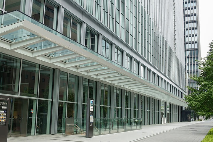 テンパードアは、強化ガラスを使用したガラス扉で、店舗や施設の入口などで多く採用されています。ガラス面が大きく開放感のある外観をつくれることや、シンプルでデザイン性が高い点が大きな特徴です。