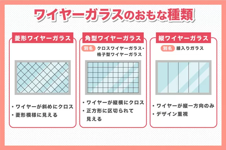 なお、このページでのワイヤーガラスについての説明の大半は、防火設備用の飛散防止ガラスとしての機能を備えている菱形ワイヤーガラスと角型ワイヤーガラスに関するものとなっています。